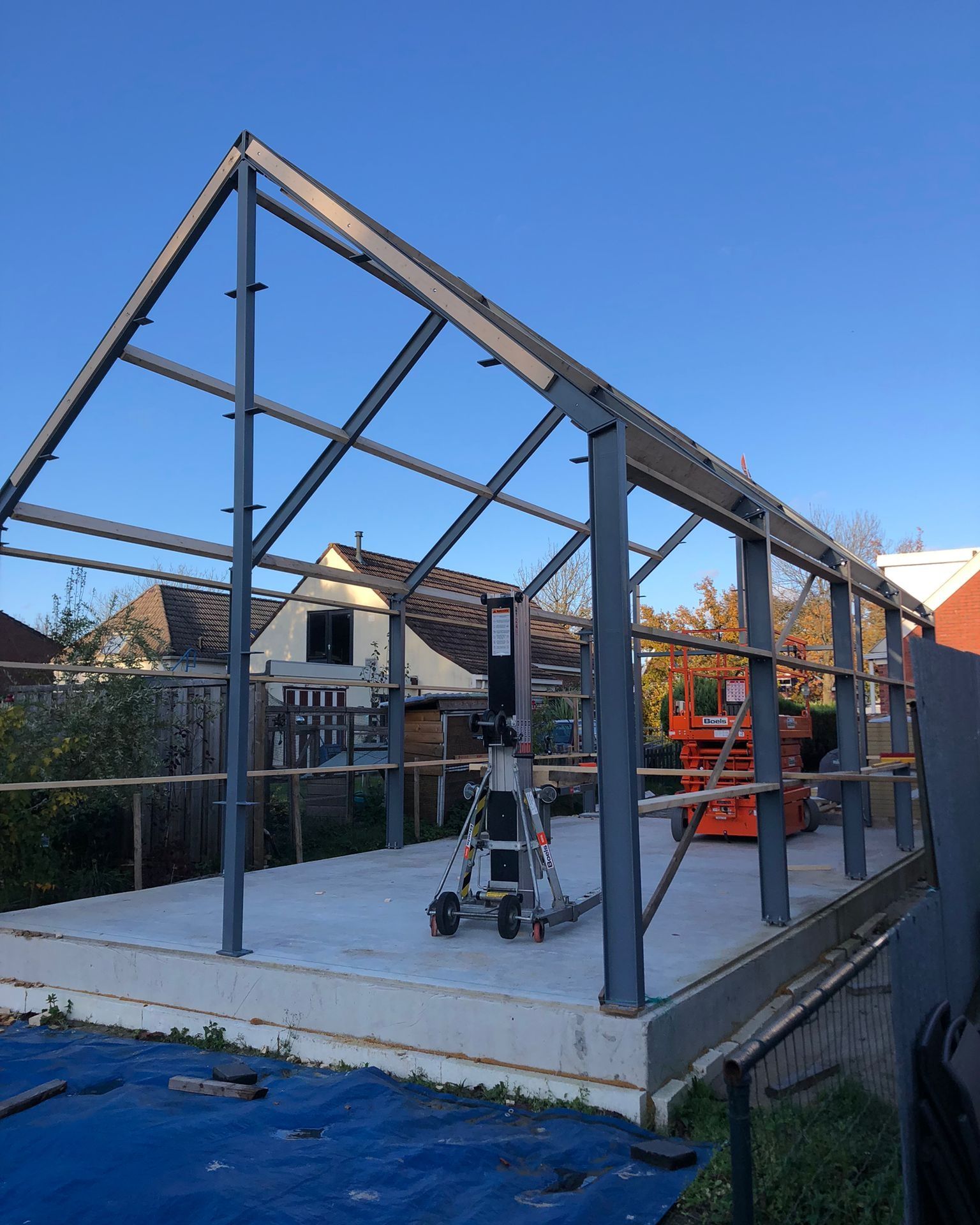 Voor dit project leverden we een complete stalen garage van 5 bij 10 meter in bouwpakketvorm. Alle onderdelen zijn op maat geproduceerd, voorzien van duidelijke montagepunten en als set geleverd op locatie. De klant heeft de montage zelf uitgevoerd, met ondersteuning op afstand waar nodig. Een praktische oplossing voor wie zelf wil bouwen, maar wel verzekerd wil zijn van degelijk materiaal.