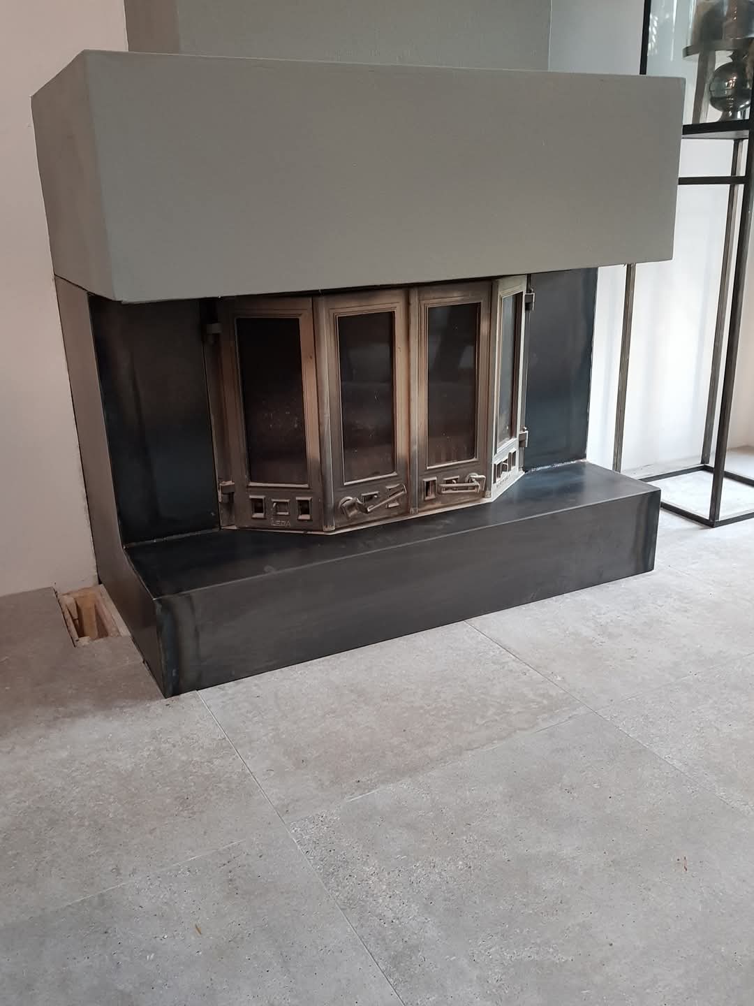 Voor deze haard leverden we een omkasting van zwart warmgewalst staal. Het materiaal is puur en onvervormd, met een robuuste uitstraling die past bij de ruimte. De platen zijn op maat gezet en strak afgewerkt. Geen poespas, gewoon degelijk werk dat klopt tot in het detail.